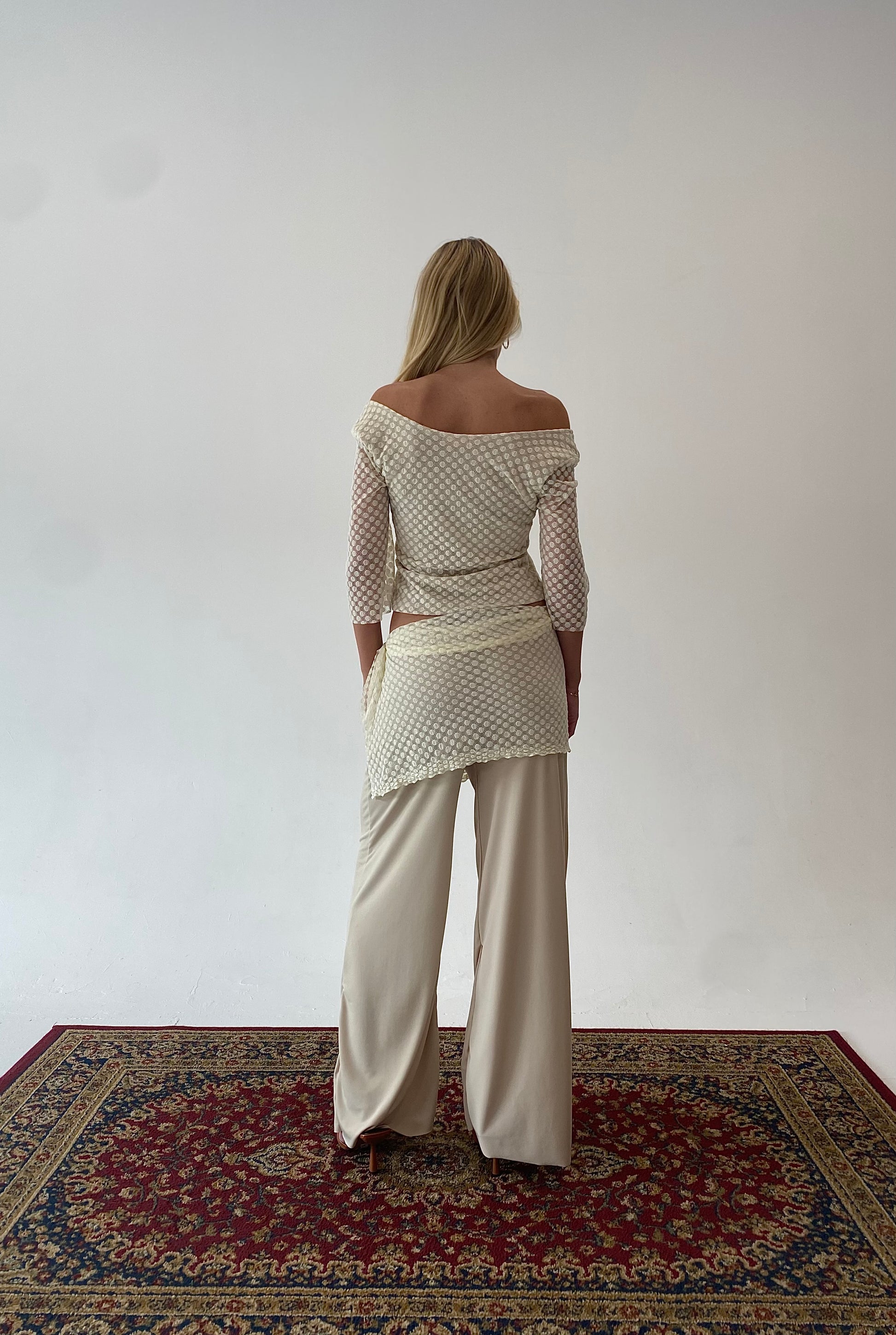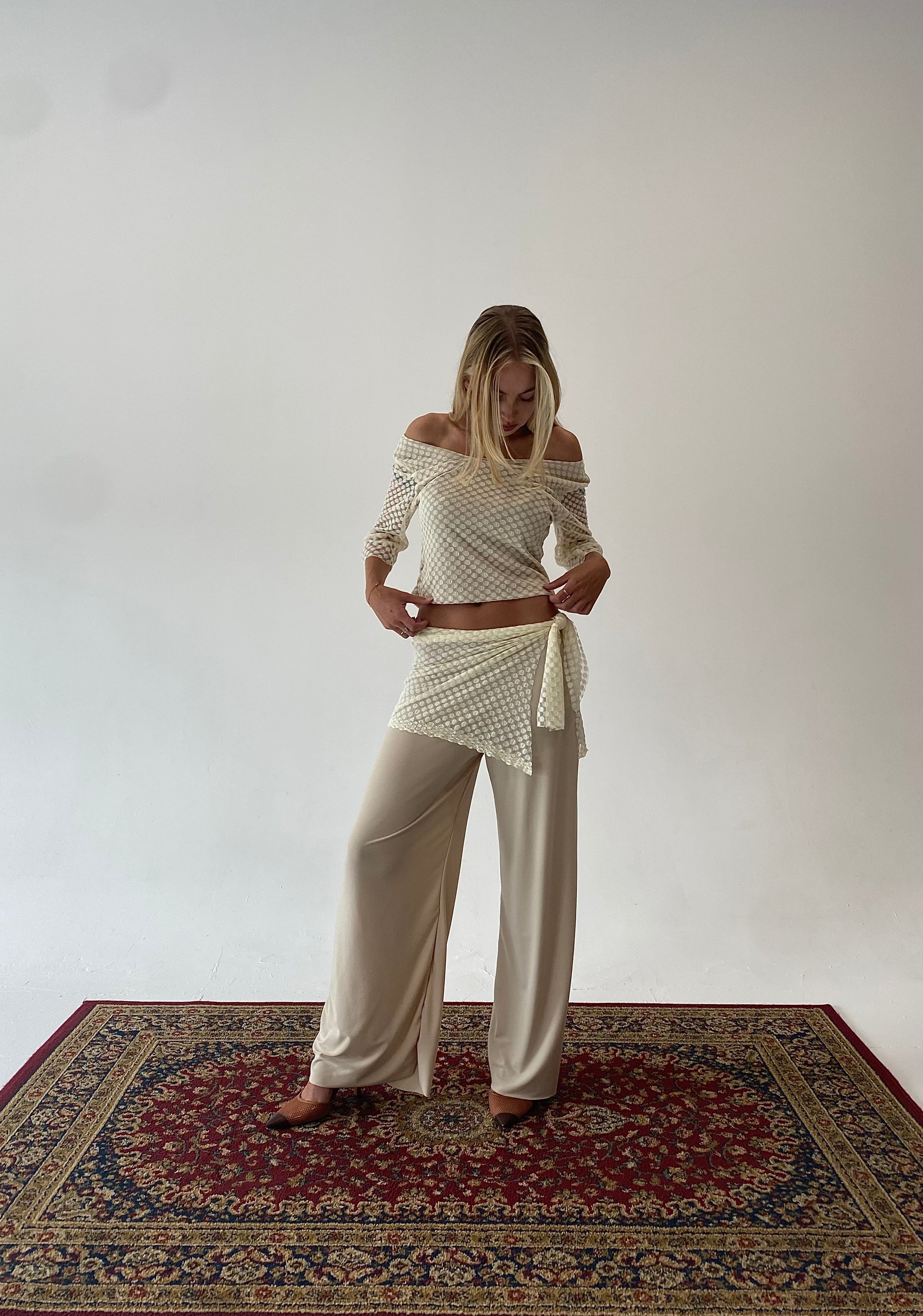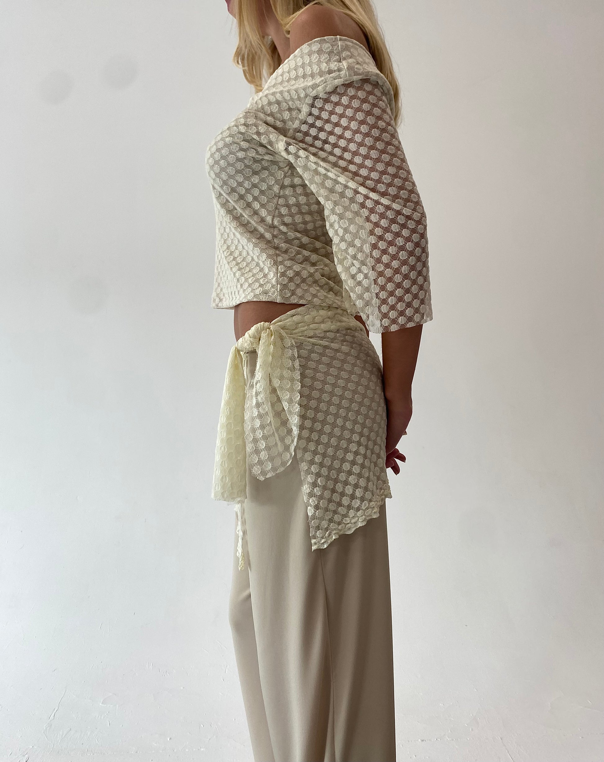 Created from a jersey stretch spandex & jersey sheer polka dot fabric. With an off the shoulder design and midi length sleeves. Pair with our Clara Polka Dot Trousers for a cute fit!