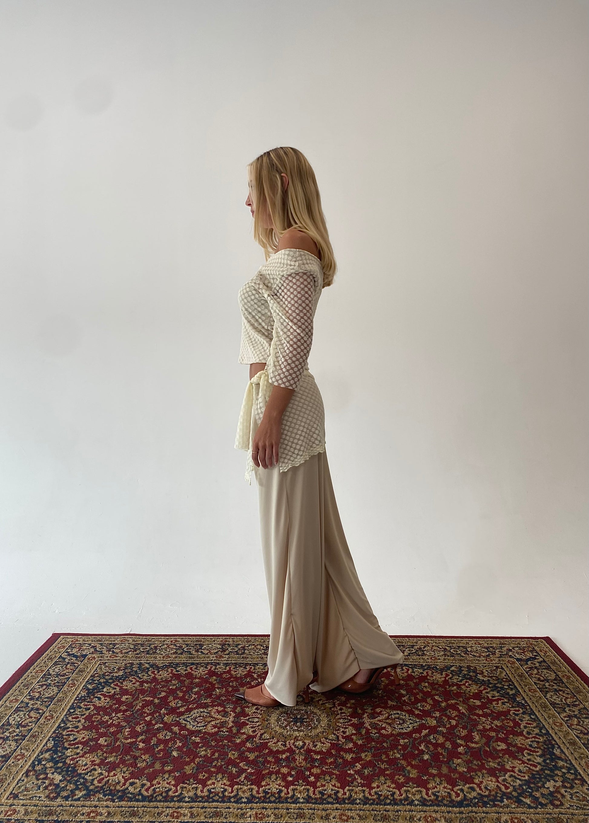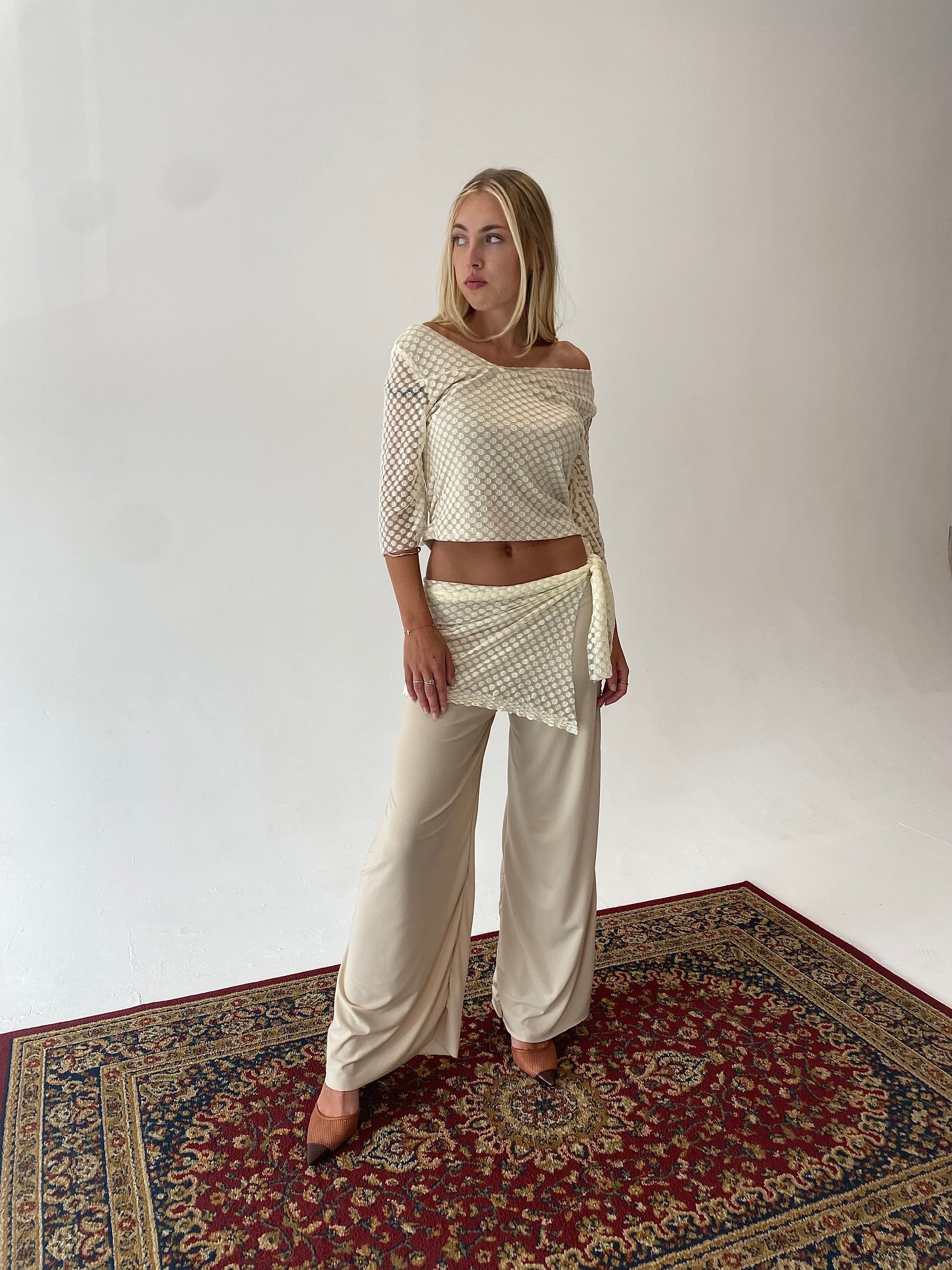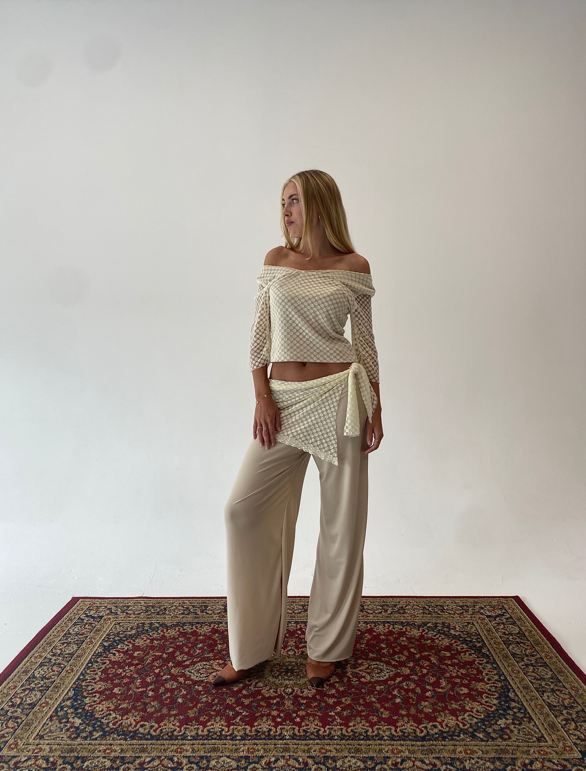 Created from a jersey stretch spandex & jersey sheer polka dot fabric. With an off the shoulder design and midi length sleeves. Pair with our Clara Polka Dot Trousers for a cute fit!