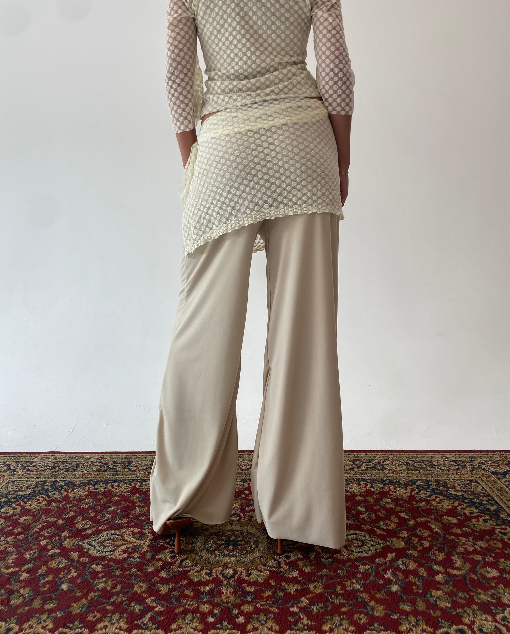 The Clara Polka Dot Wide Leg Trousers have been created from a jersey stretch spandex & jersey mesh polka dot fabric. With a wide leg style, and wrap around front which you can adjust to your waistline.